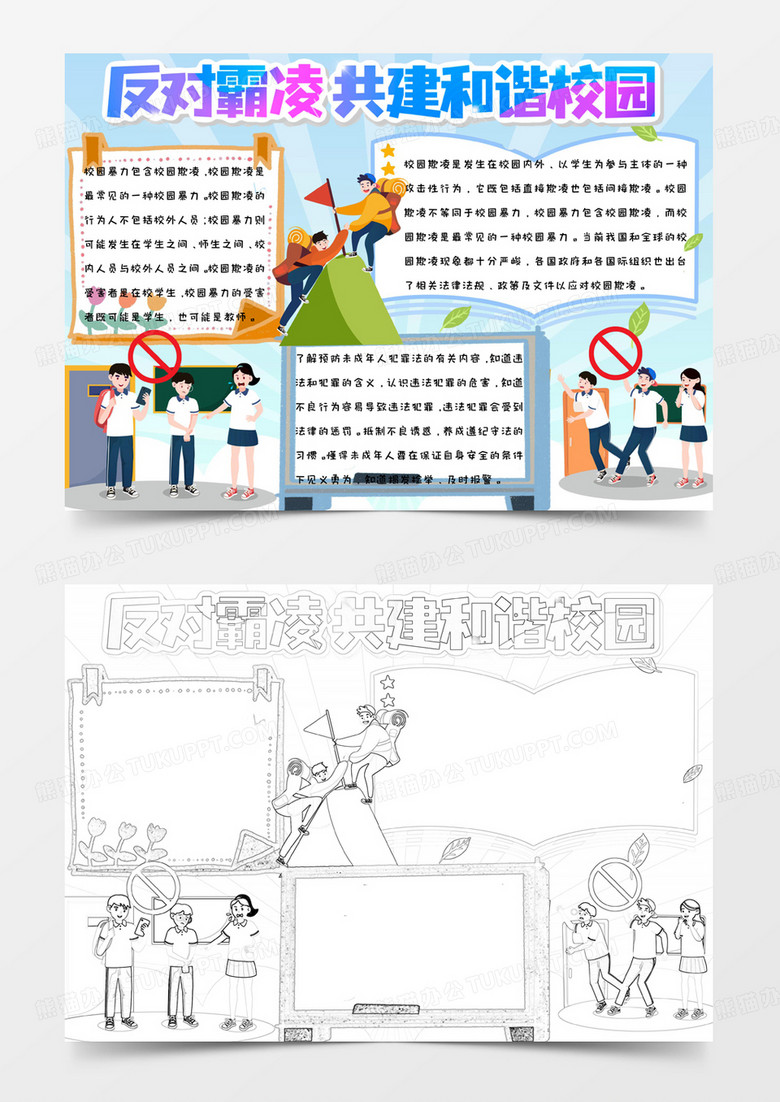 本作品内容为蓝色背景简约卡通反对霸凌共建和谐校园手抄报小报word模版, 格式为 docx, 大小11 MB, 页数为1, 请使用软件Word(2007)打开, 作品中主体文字及图片可替换修改,文字修改可直接点击文本框进行编辑,图片更改可选中图片后单击鼠标右键选择更换图片,也可根据自身需求增加和删除作品中的内容, 源文件无水印, 欢迎使用熊猫办公。 如认为平台内容涉嫌侵权,可通过邮件:tousu@tukuppt.com提出书面通知,我们将及时处理。