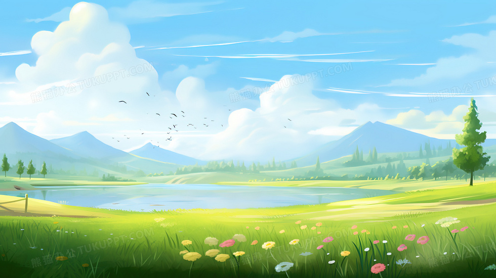 本作品内容为春天绿意盎然的草地花朵美景插画, 格式为 jpg, 大小5 MB, 图片尺寸为2912 x 1632, 源文件无水印, 欢迎使用熊猫办公。 如认为平台内容涉嫌侵权,可通过邮件:tousu@tukuppt.com提出书面通知,我们将及时处理。