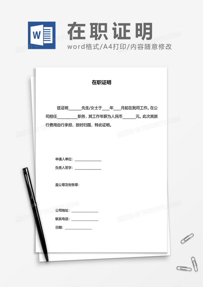本作品内容为公司员工在职证明word模板, 格式为 docx, 大小1 MB, 页数为1, 请使用软件Word(2010)打开, 作品中主体文字及图片可替换修改,文字修改可直接点击文本框进行编辑,图片更改可选中图片后单击鼠标右键选择更换图片,也可根据自身需求增加和删除作品中的内容, 源文件无水印, 欢迎使用熊猫办公。 如认为平台内容涉嫌侵权,可通过邮件:tousu@tukuppt.com提出书面通知,我们将及时处理。